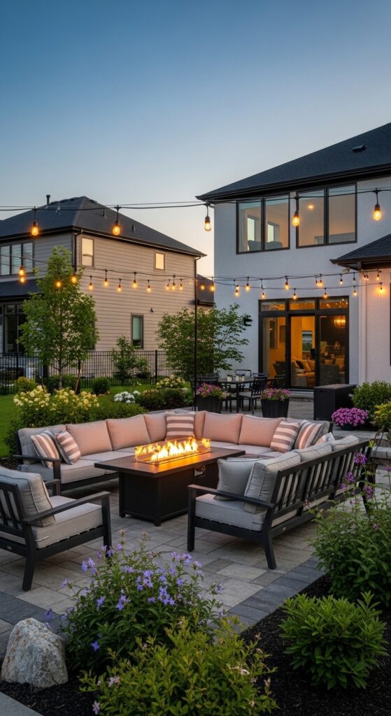 A modern fire pit table creates warmth and serves as the centerpiece for gatherings — especially popular in suburban US homes.
