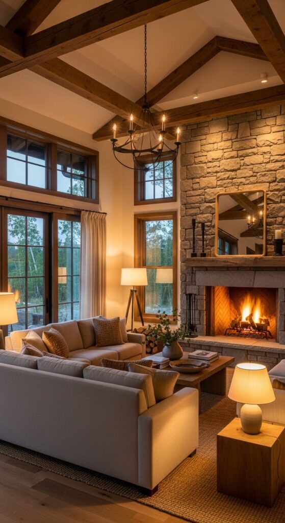 Combining beams with a stone fireplace enhances the cozy yet sophisticated look.