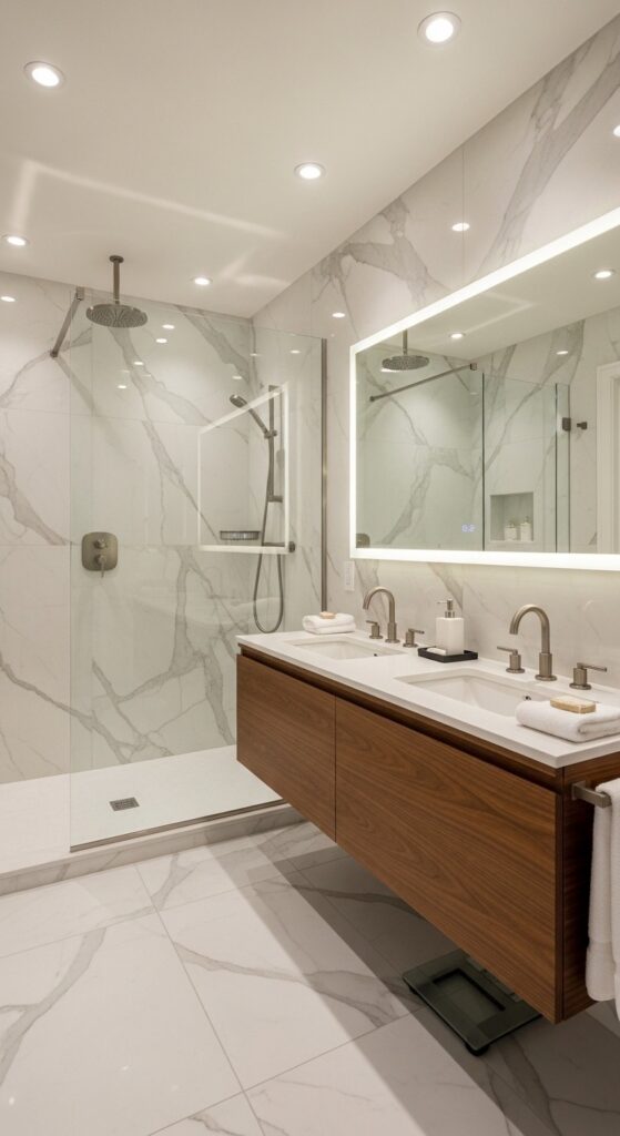 Luxury doesnโt require large square footage. Smart lighting, clean lines, and bright materials can transform a small bathroom into a spa-like sanctuary.