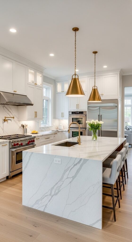 Upgrade your US home with modern kitchen remodel ideas featuring recessed ceiling lighting, white cabinets, and functional islands.