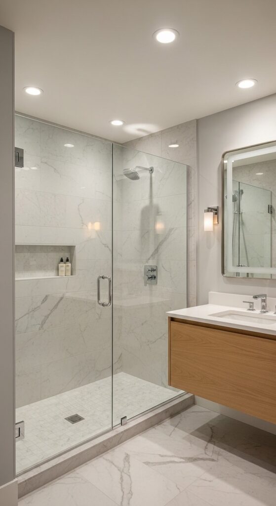 Ceiling lighting is key in bathrooms. Recessed LED lights distribute brightness evenly and create a spa-like atmosphere.