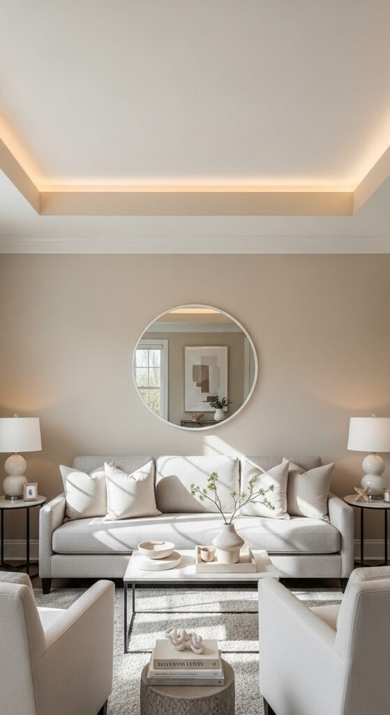 Small living rooms don’t have to feel cramped. With tray ceiling design, neutral decor, and intentional furniture choices, you can create a bright, elegant space that feels far larger than its square footage.